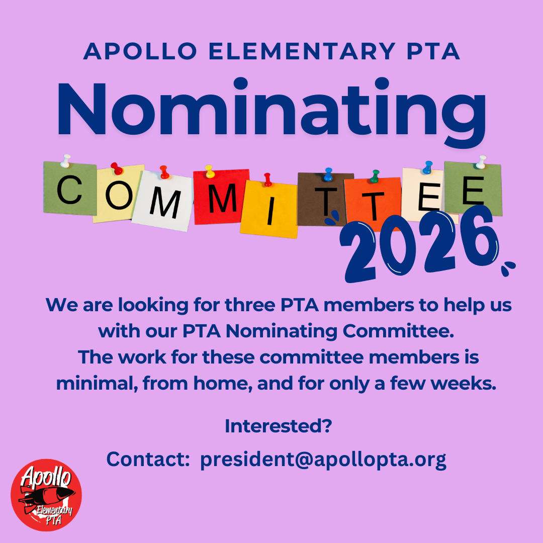 We need 3 PTA members to be the nominating committee to help find volunteers to be on the board of the PTA for the next school year. Serving on this committee is a short-term, highly impactful way to help your school community—no prior experience is required, just good judgment, discretion, and an interest in supporting strong PTA leadership. We can't do this without you! Please reach out to president@apollopta.org for any questions. The nominating committee is voted in at the general meeting on 1/28/26, so we need volunteers urgently!