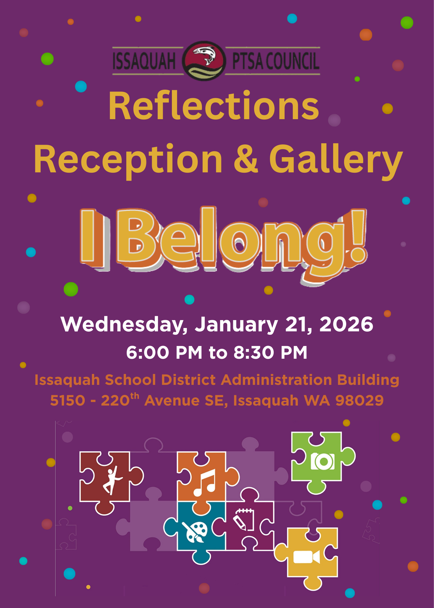 We would like to invite you all to the Reflections Art Reception that will be held on January 21st from 6-8:30PM at the Issaquah School District Administrative Building.