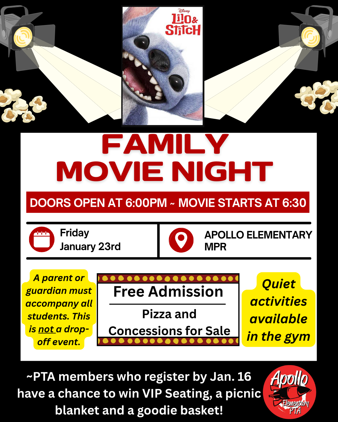 Bring your family for a fun evening at our FREE Movie Night! Join us for Disney's New Lilo & Stitch movie! Date: January 23, 2026 Admission is FREE! Please pre-register on the PTA website!! Quiet activities will be available in the Gym. PTA Members who pre-register by Jan. 16th will be entered to win a VIP package that includes VIP seating, a picnic blanket, and a goodie basket! Come in your comfiest clothes, bring a blanket, pillow, or chair and get ready to enjoy a fun movie with your school community! We can’t wait to see you there! STAFF APPRECIATION DAY!